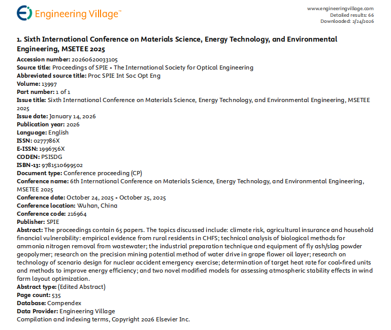 All papers submitted to MSETEE 2025 all accepted papers have been published by SPIE - The International Society for Optical Engineering (ISSN: 0277-786X) in the Conference Proceedings (https://www.spiedigitallibrary.org/conference-proceedings-of-SPIE/13997.toc), and submitted to EI Compendex and Scopus for indexing.